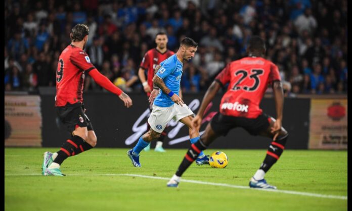 Il Napoli non riesce a battere il Milan al “Maradona”, ma almeno riesce a recuperare due gol di svantaggio dopo un brutto secondo tempo. Il posticipo della domenica sera ha visto protagonisti il Napoli di Rudi Garcia contro il Milan di Stefano Pioli. I rossoneri padroni del primo tempo, raggiungono il vantaggio al minuto 22′ grazie ad un cross di Pulisic che trova Giroud solo in area che la insacca di testa. Nemmeno 10 minuti dopo ed arriva il raddoppio, sempre del solito francese, stavolta su assist di Calabria. Del Napoli pochissimi sprazzi, Kvaratshkelia tenta l’imbucata in area, cross rasoterra per Politano che non incrocia e manda la palla all’esterno della rete. I primi 45 minuti si concludono con un Milan padrone del gioco e del campo, con gli azzurri che faticano a creare occasioni concrete. Si riparte nel secondo tempo con Garcia che ne cambia tre: dentro Olivera, Simeone e Ostigard per Mario Rui, Elmas e Rrahmani. Al 50′ arriva il gol di Politano, che con un sombrero a Pellegrino, scarta Hernandez e calcia con potenza in porta, il Napoli riapre la partita.